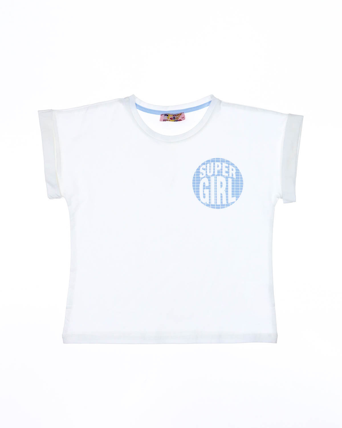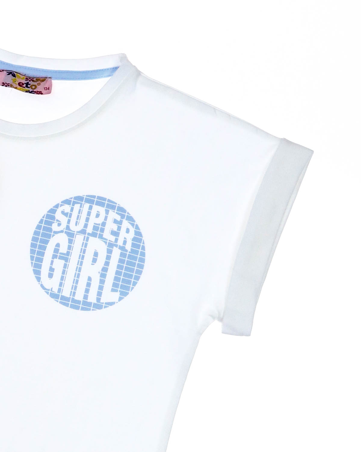 Футболка укороченная со спущенной линией плеча. Рукава оформлены отворотами.На груди неброский принт.
