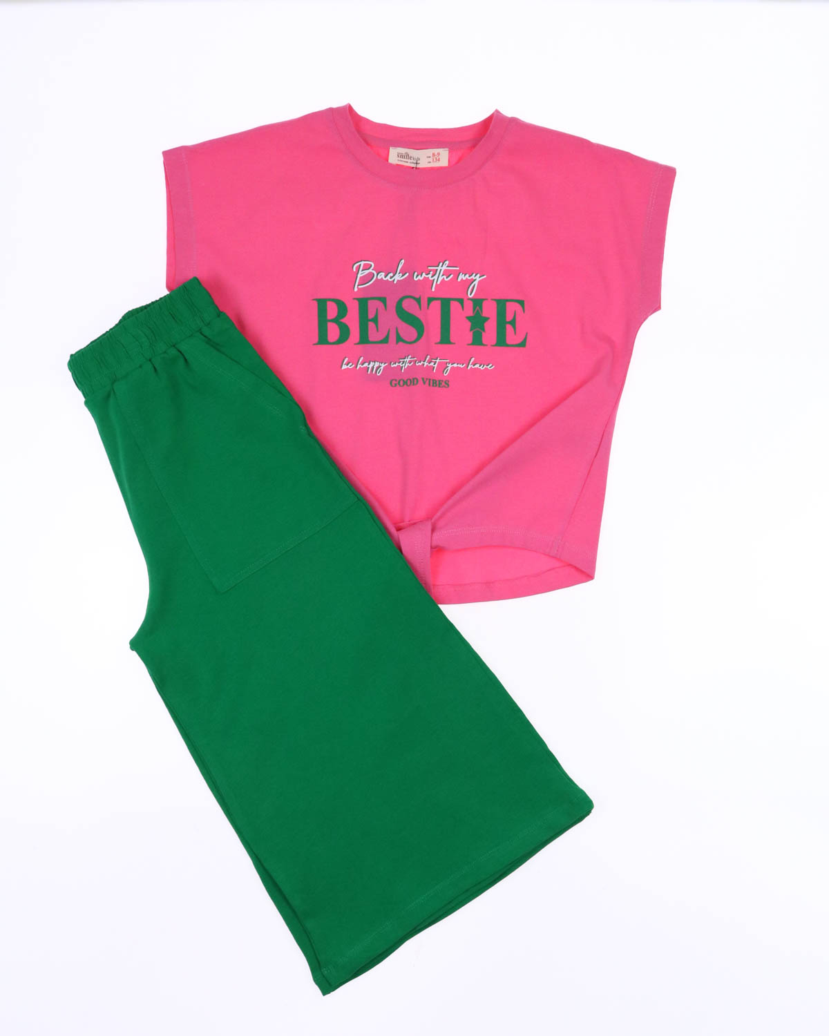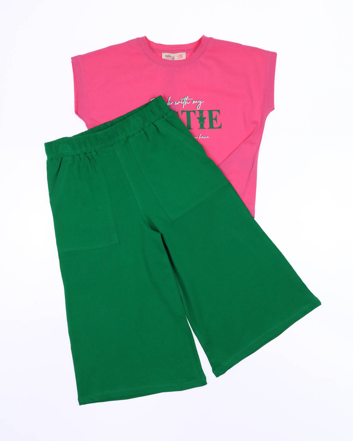 Представляем вам яркий летний костюм Smile для девочек оптом. Укороченная футболка со спущенным рукавом на завязках и широкие брюки-кюлоты. Костюм выполнен из мягкого трикотажа кулирка.
