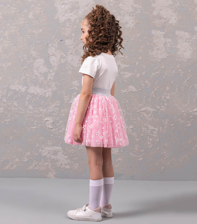 Нарядный костюм DMB для девочек оптом является уникальным предложением на рынке детской моды. Он произведен в Турции, известной своим качеством и безупречным стилем. На груди футболки расположен принт, который придает еще больше индивидуальности этому наряду. Юбка этого костюма также привлекает внимание. Она имеет широкую блестящую резинку, которая обеспечивает идеальную посадку на талии. Юбка сама по себе пышная и держит форму благодаря дополнительной юбке из сетки и хлопковому подъюбнику. Такое решение не только придает объем юбке, но и создает особый эффект при движении.