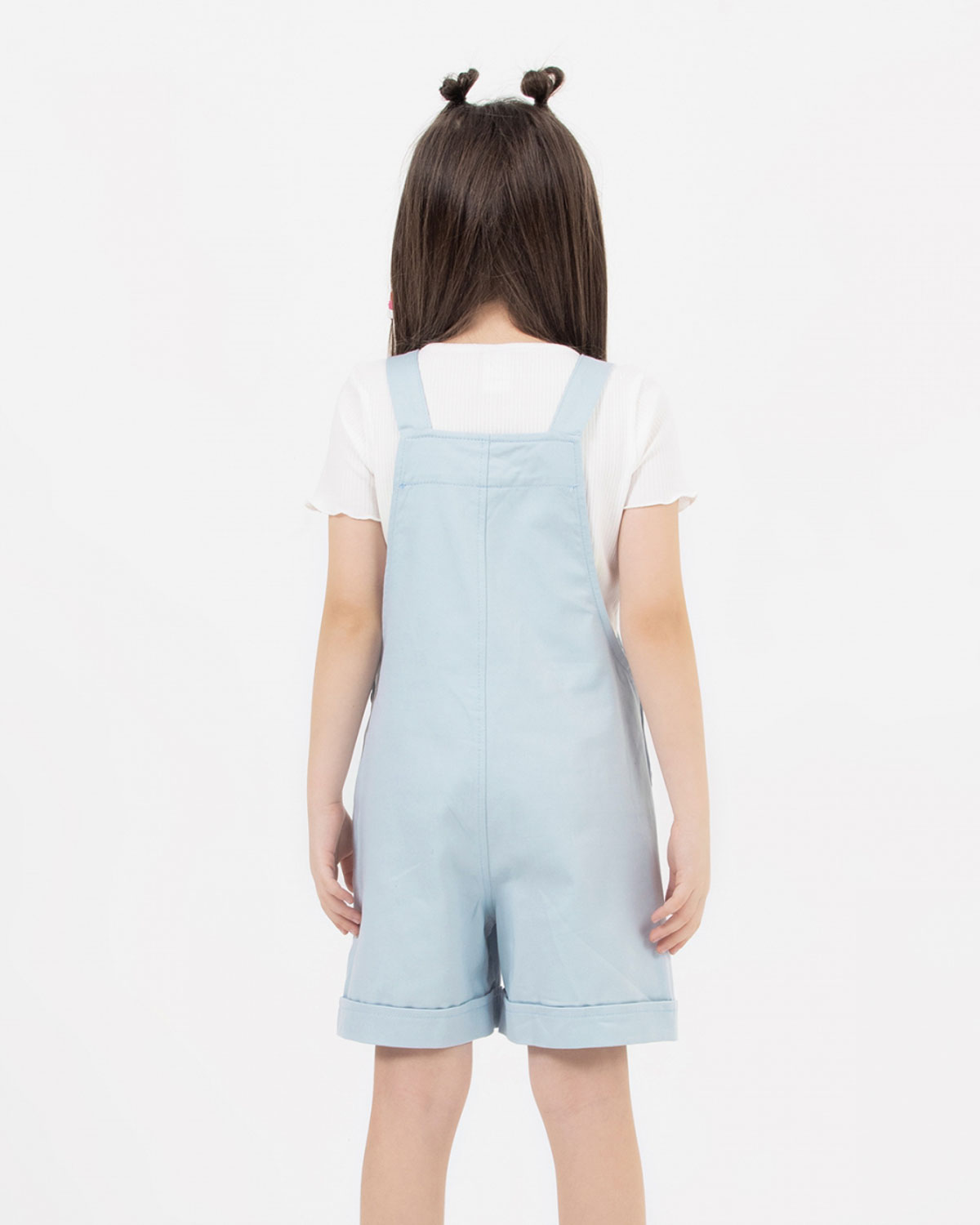 Комбинезон выполнен из хлопкового денима в пастельных тонах, спереди два накладных кармана, лямки пристегиваются на пуговицы, низ шорт оформлен отворотами. Детский джинсовый комбинезон для девочки оптом с доставкой по России в интернет-магазине Tamriko.