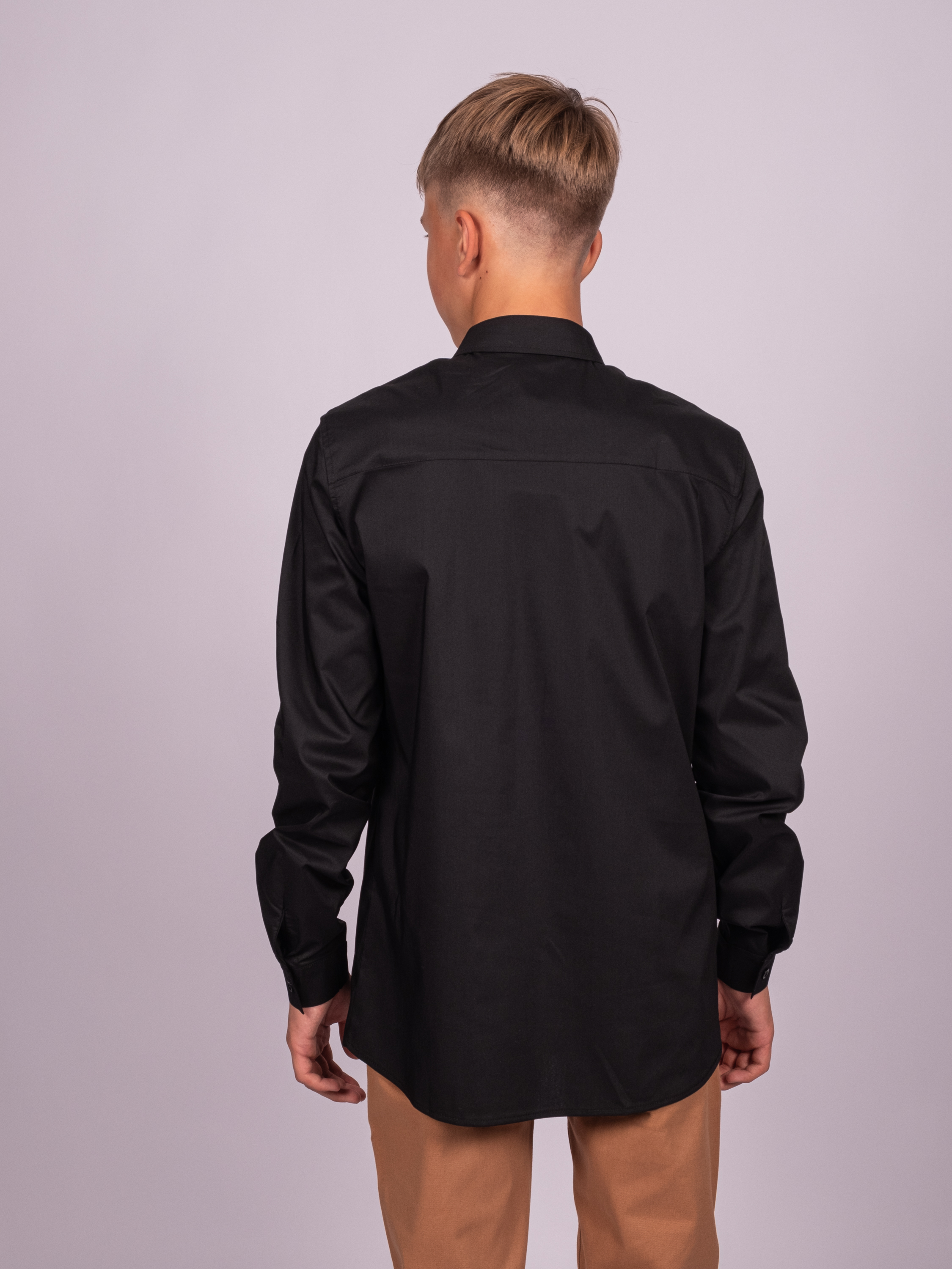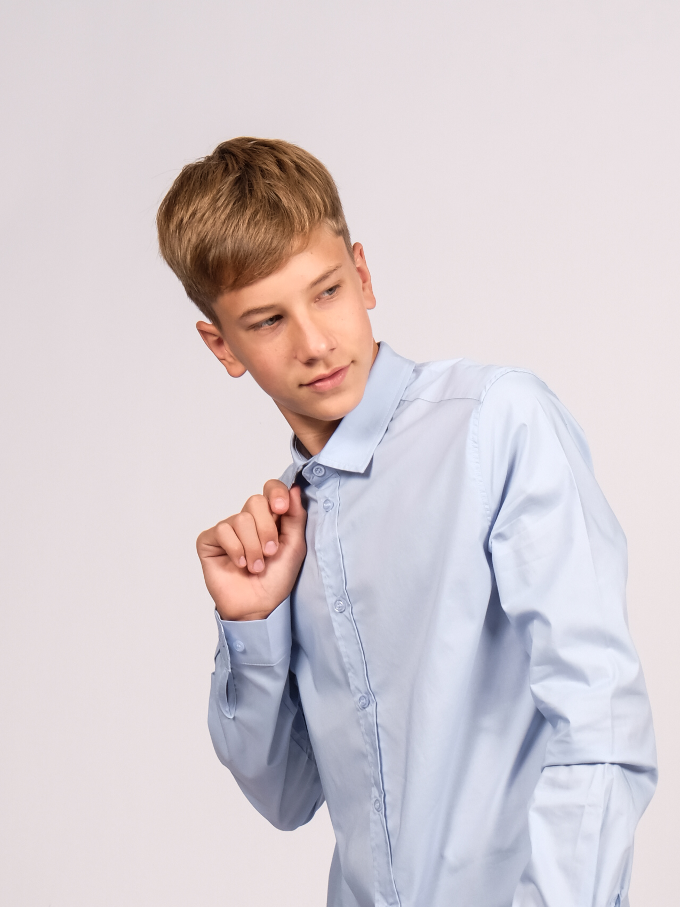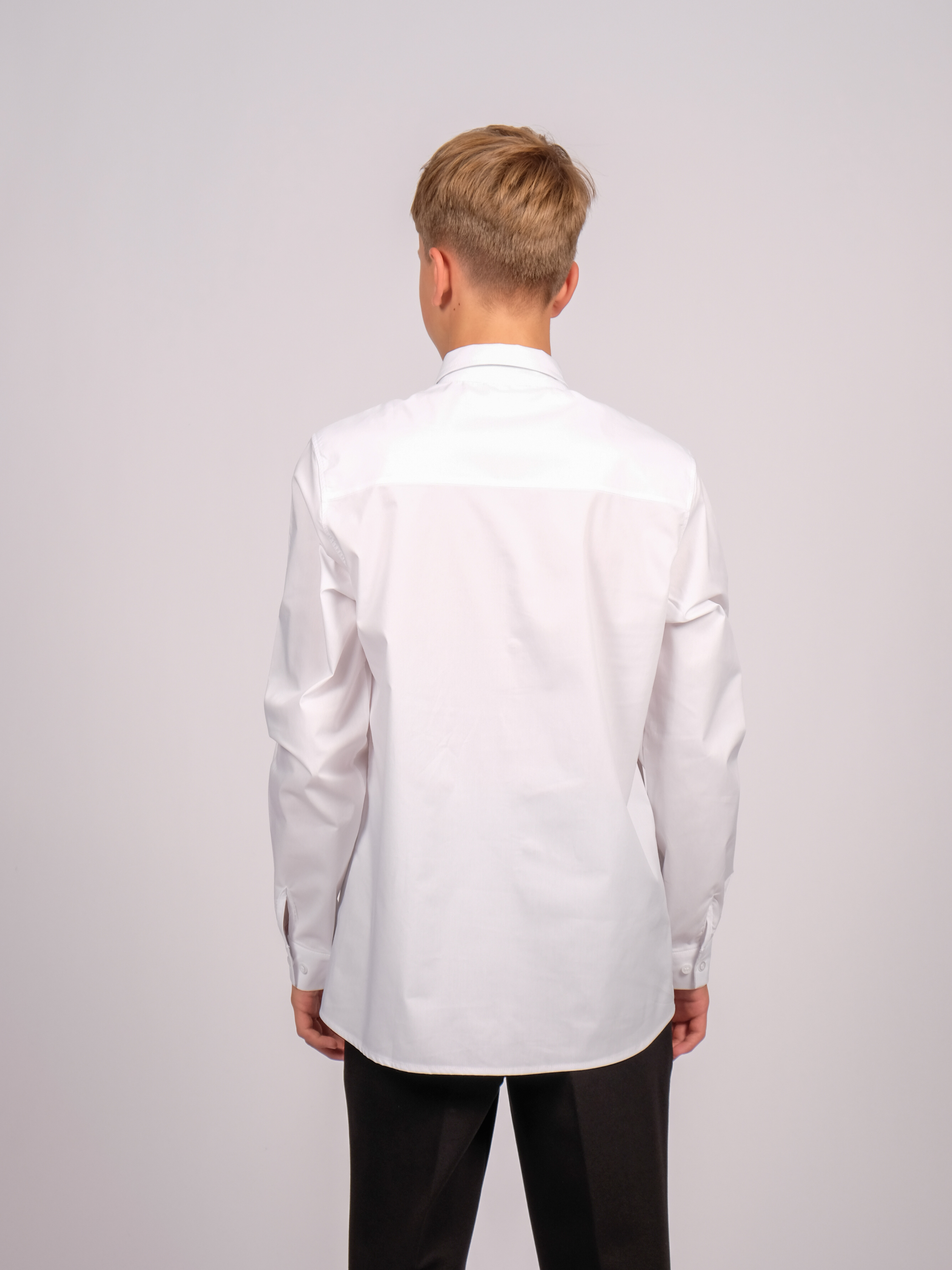 Оптовая продажа однотонных школьных рубашек для мальчиков. Изделие выполнено из высококачественной ткани с добавлением смесовых волокон. Рубашка оснащена пуговицами для застегивания и имеет приталенный крой.
