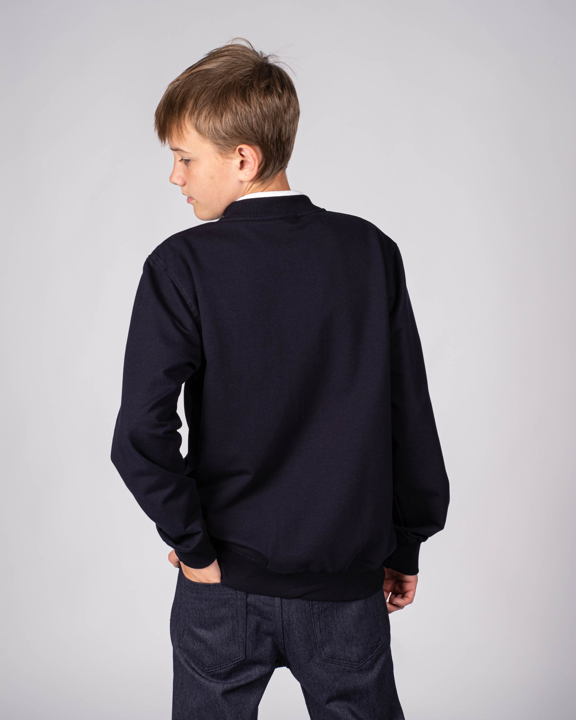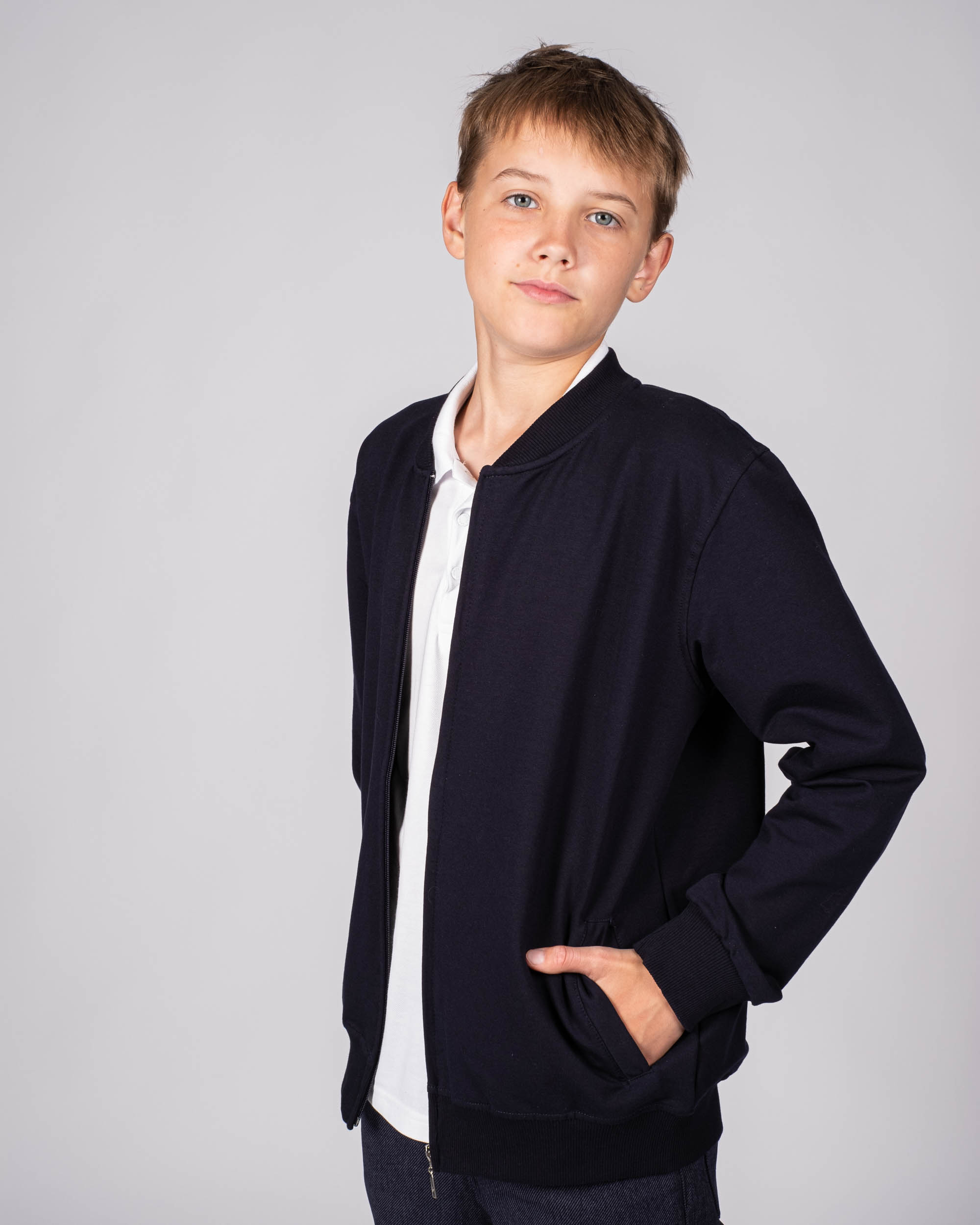 Трикотажный бомбер Cegisa для мальчика оптом. Выполнен из смесовой ткани, в составе которой натуральный хлопок с  добавлением полиэстера. Воротник стойка. Низ изделия и рукава на трикотажном манжете. Вместительные карманы и разъемная застежка - молния. Хорошо сохраняет цвет и форму при длительной носке и после многократных стирок. Прекрасно будет смотреться как школьная форма.