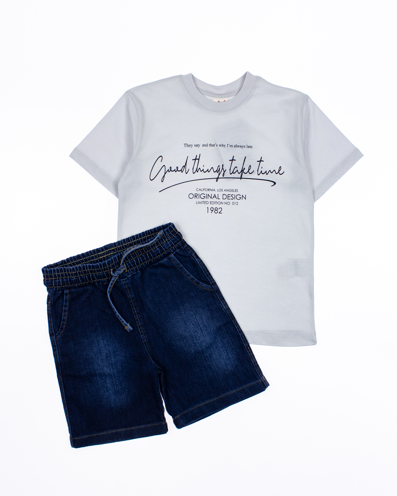 Летний костюм dmb для мальчика оптом. Футболка прямого кроя с короткими рукавами. Бриджи джинсовые с карманами. Пояс на резинке с функциональным шнурком позволяет ругулировать объем на талии. Большой выбор костюмов для мальчиков по низким ценам в интернет-магазине Tamriko оптом.