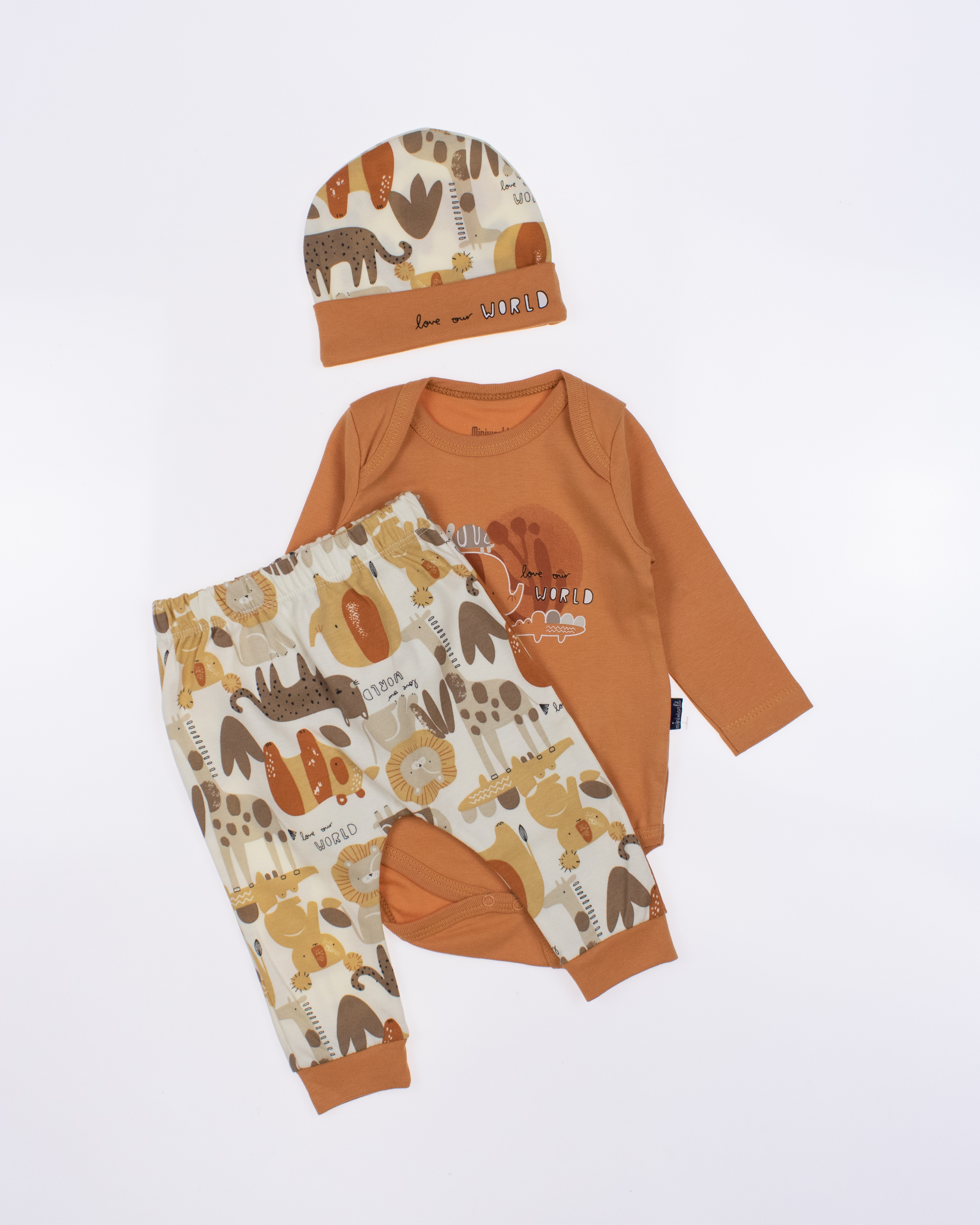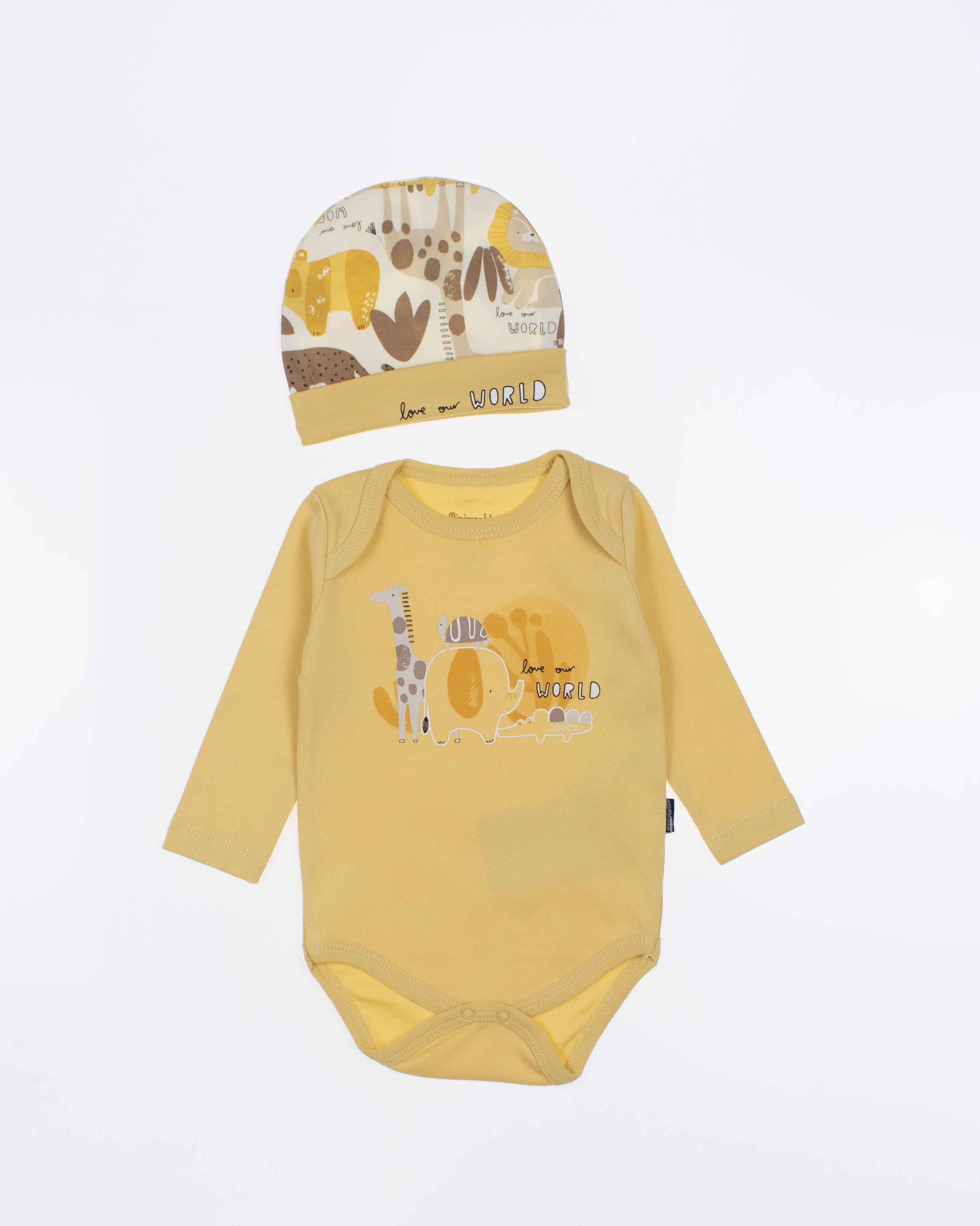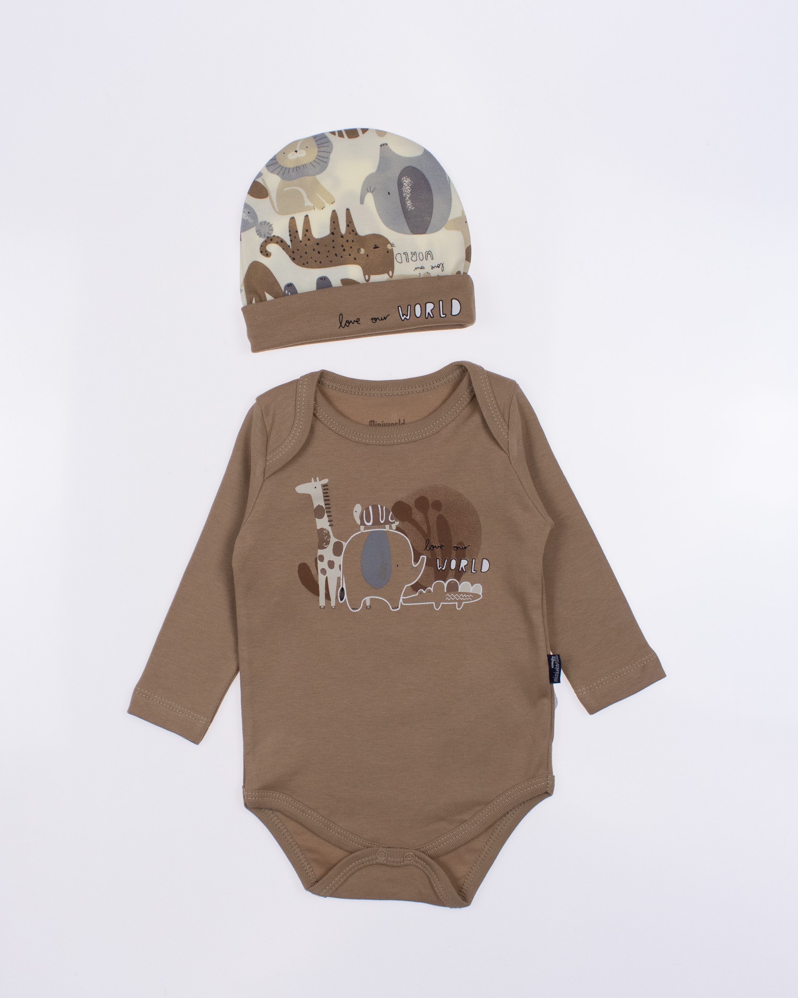 Детский боди MINIWORLD с длинным рукавом, штанишки и шапочка - комплект, который подойдет малышам с самых первых дней жизни. Боди для новорожденного  очень удобен, снизу оснащён кнопками, благодаря которым маме будет удобно в любое время менять памперс  ребенку.