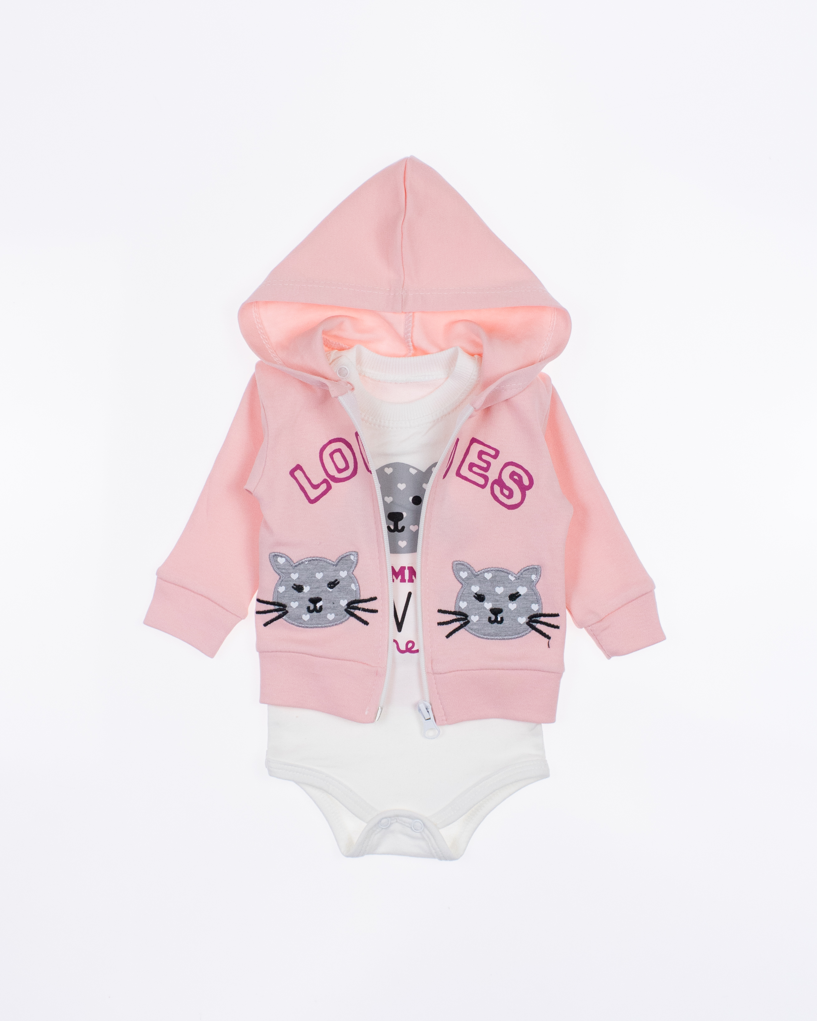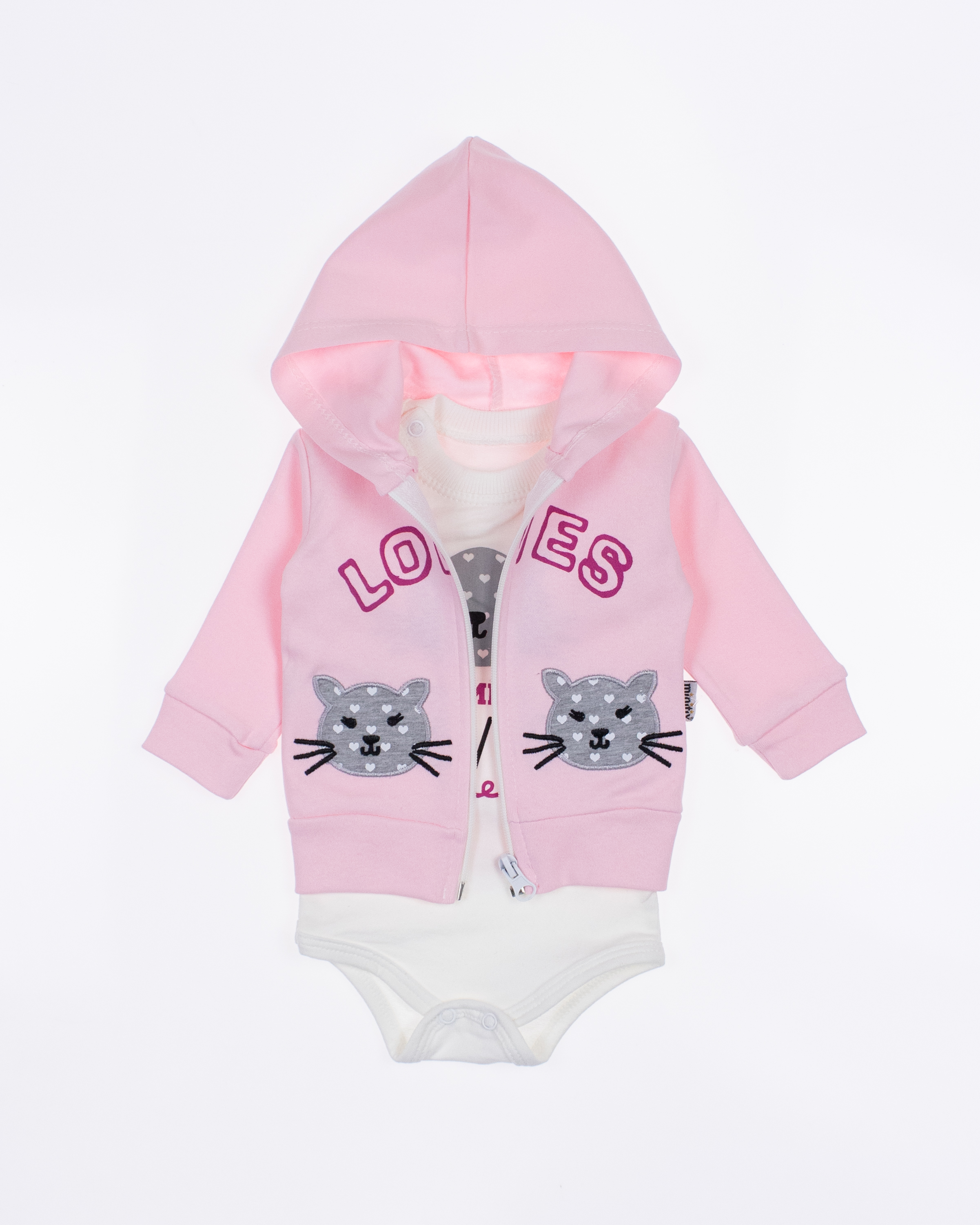 Костюм MINITIX с боди  для малышей очень комфортно в использовании, не стесняет движений. Изготовлено из 100% хлопка. Застежка  снизу позволит в считанные секунды переодеть малышку. Комфортная кофточка на молнии, штанишки на мягкой резинке на манжетах.